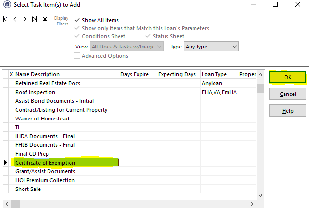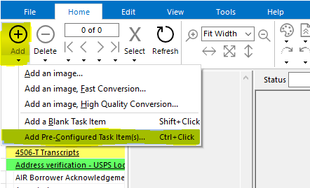 2) Click on down arrow under Add in the top left corner, then select Add Pre-Configured Task item